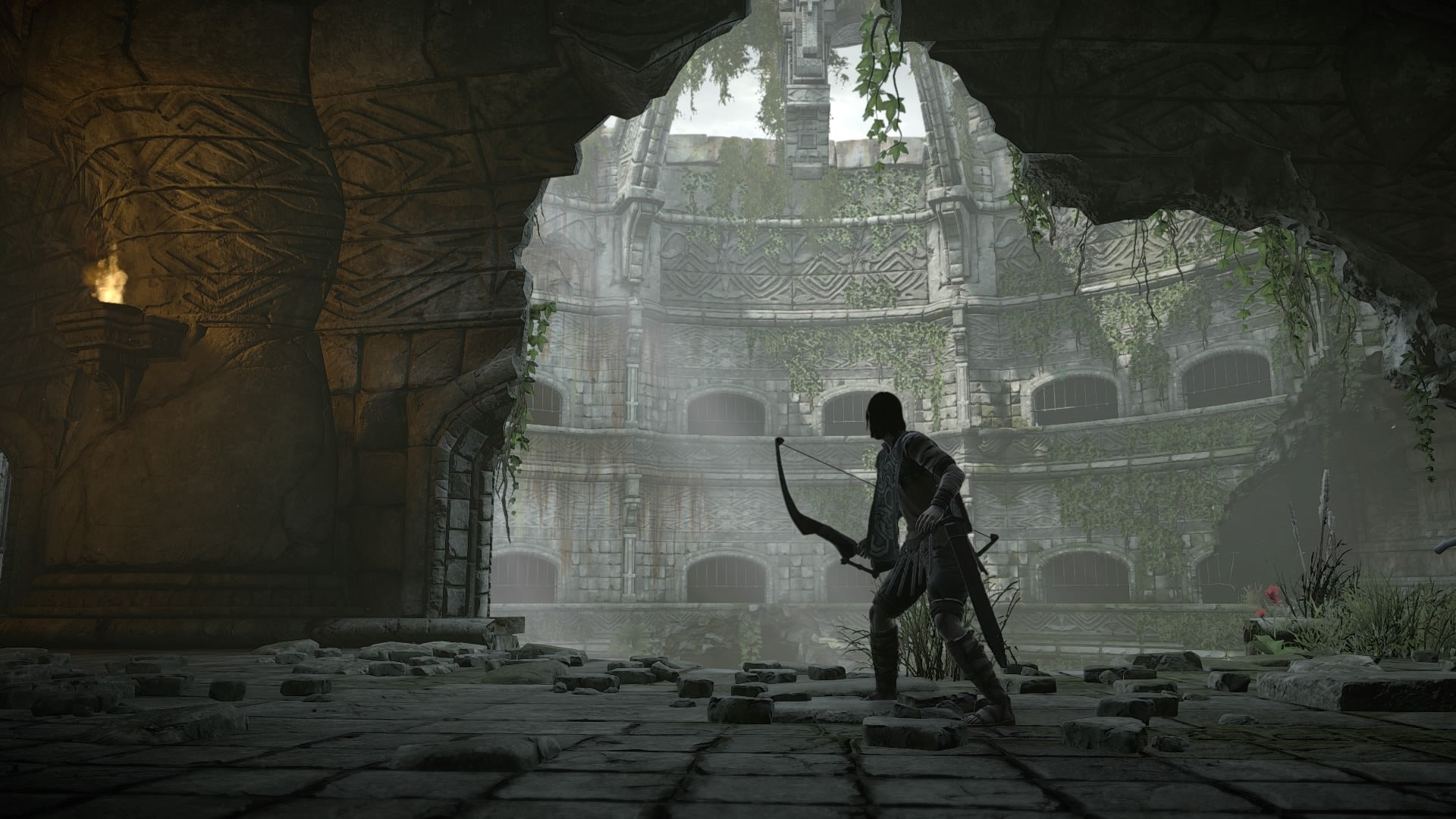 Before you endeavour to become the Colossi'southward attention, plough correct and go downwards two flights of steps to make it on a floor with a massive gap smashed out of it. This split in the colosseum goes all the way down on opposite sides, and it's where yous going to get the Colossi'southward attending and jump downwardly on to it when y'all've flipped it onto its back.